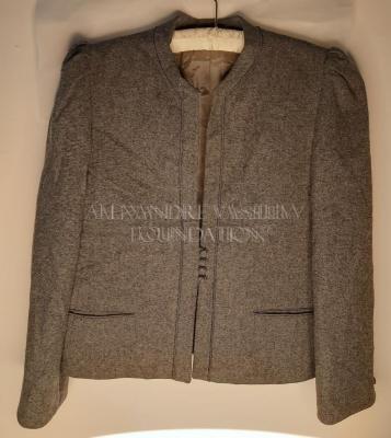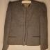 A greige wool flannel women's jacket trimmed with matched silk cord. A shift, just below the waist length collarless jacket features a V-neck, fastened with four covered buttons and hinged loops, has sleeves with gathered caps and two welt pockets at the bottom of the forefronts.