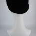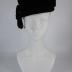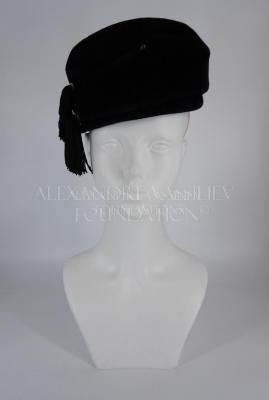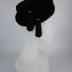 An asymmetrical black felt toque hat in 1930s Balenciaga style, with a turn-up (which is fastened to the front crown with a snap) and a crown itself raised high at front, forming a crest above the forehead, decorated with two tassels of black silk cordonette, secured on the right side by two silver brooches with rhinestones.