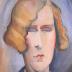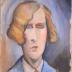 Portrait depicting a blonde woman facing the camera, with short, slightly wavy hair. Her elongated face, her almond-shaped, vacant blue eyes, and her delicately drawn red lips lend the portrait an introspective quality. She wears a light blue jacket over a pale blouse, buttoned high at the collar.