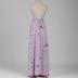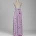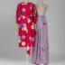A damask silk Haute Couture ensemble (No. 43006 and 49542) comprising of a fuchsia sheath dress with shiny polka dots and printed ivory, lilac and violet flowers and maxi skirt of companion lilac with fuchsia flowers silk, both with matching sashes. The below the knee dress, collarless with piping that rear ties with a small slit for the head, with lantern sleeves to the elbow on the thin cuffs, has pockets in the side seams, the hem is edged with lilac companion fabric; with a separate sash made of the fuchsia silk. The floor length lilac damask silk skirt with shiny dots and printed fuchsia florets is gathered at the waistband, edged with fuchsia companion fabric, lined with lilac rayon silk satin and has it's own separate sash of lilac silk.