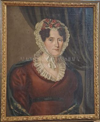 Portrait of a young lady dressed in an Empire style Adelaide color silk decolletage dress, trimmed with a frilled lace collar. She wears a lace bonnet and a Cashmere shawl with the paisley design.