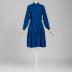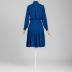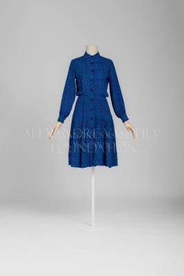 A blue silk with black polka dots dress with a slouchy bodice, adorned with two knife pleats by each side of the placket, on the back of the bodice has one box pleat, stitched from the top to the shoulder blades; a button-down fastening on ten black plastic buttons with one more on each cuff of the long gathered sleeves, a waist-cut, below the knee length skirt has narrow box pleats, that are stitched to the hips.