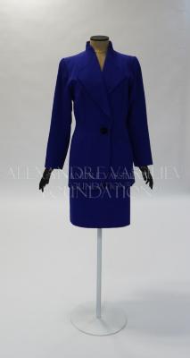 A violet suit with a fine wool long jacket fitted with darts and a thick silk satin pencil skirt. The swan necked jacket with wide lapels is fastened with a single large button, three the same, but smaller, we can see on the sleeve vents, it has slanted welt pockets with wide leaflets on the hips; a pencil skirt with a topstitched belt and slanted pockets in the side seams is zip closed on the left side.
