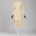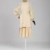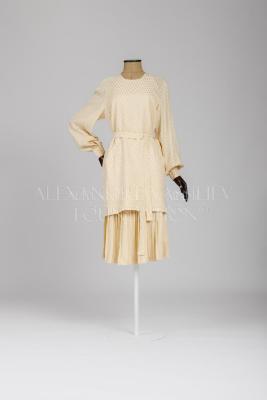 An ivory damask silk with shiny polka dots cocktail ensemble with a long shift blouse and a knife pleated skirt. The collarless blouse with long raglan sleeves, that gathered to the cuffs, is rear fastened with nine covered buttons with welt loops, and has three the same at each cuff, and two slanted welt pockets at front; a pleated skirt below the knee length with an elastic waistband has a yoke to the hips and a separate thin sash.