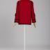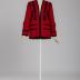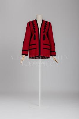 A burgundy red coarse wool jacket trimmed with the "Berber" elements – the black zig-zag passementerie and the decorative tassels; collarless, longsleeved, without a closure, with rectangular patch pockets at the bottom of the foreparts, trimmed with a black silk braid with a cord imitation in the middle and black silk tassels at the ends.