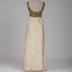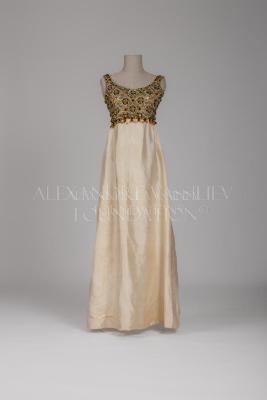 A floor-length ivory shantung silk Balmain Haute Couture evening gown, sleeveless, with empire cut embroidered bodice. The rear zip fastened bodice with a wide scoop neckline and open to the blades back is totally embroidered with gold thread, artificial pearls, turquoise, brown, and green oblong stones, silk orange flowers with golden outline and orange rhinestone cores, transparent oblong beads, barrel-shaped golden beads, which also form a short fringe by the bodice edge.