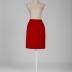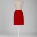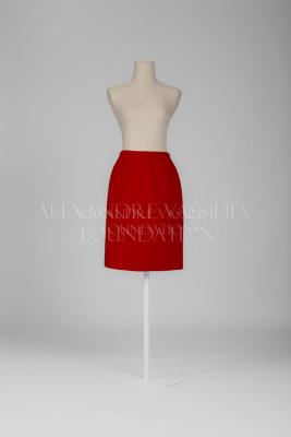 A brick-red fine wool pencil skirt with rear central seam and slanted darts from the side seams, topstitched with silk floss, has a short rear vent and a red grosgrain ribbon, that stiffened waistline; lined with a red silk.