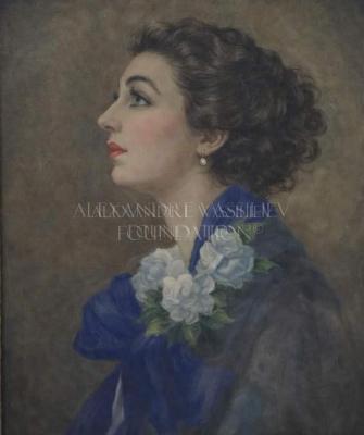 Pastel portrait of a young lady in a profile. The sitter is dressed in a deep blue, elegant coat with a large bow and an attached bouquet of white silk flowers