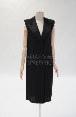 Black silk sleeveless smoking dress with shoulder pads, black silk satin lapels, stitched up to the knee with a deep wrap and a high vent at front, midi length. From Lanvin RTW SS 2012 collection.