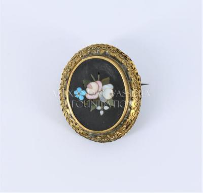 Pietra Dura features hard stones shaped and fitted together closely, almost like a jigsaw puzzle. It first appeared in Rome in the 16th century, reaching its full maturity in Florence. The technique dates to ancient times, but before pietra dura was used in jewellery, it was used for floors, ceilings, decorations on tables, etc. During the Etruscan revival and Pompeii discovery period of the 1860's and 1870's when tombs were excavated, marvelous floors and ceilings were revealed and the look was translated into jewellery, boxes and other portable items to take home from the Grand Tour.
