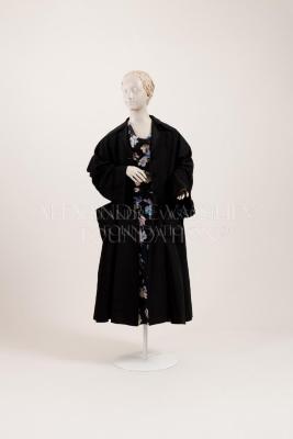 Black silk coat decorated with 3 silk covered buttons and pockets