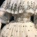 White organdy blouse and tiered skirt, embroidered with irridescent emerald green to cobalt blue beetle wings forming floral pattern.