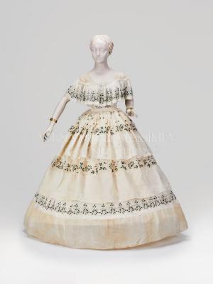 This rare transformer dress, which can be worn for dinner or with two other corsages, for the theater or the ball, is embroidered with silver wire and scarab wings. Seven species of beetles were used to obtain tones ranging from emerald green to cobalt blue. Women of the mid-19th century were particularly looking for decorations that reflect the light, then candle. For this, they wore jewels using large stones and put on their clothes glass beads, sequins or here scarab wings.
