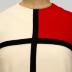 Mondrian-style woolen dress with white and red cubes, separated with black bands.