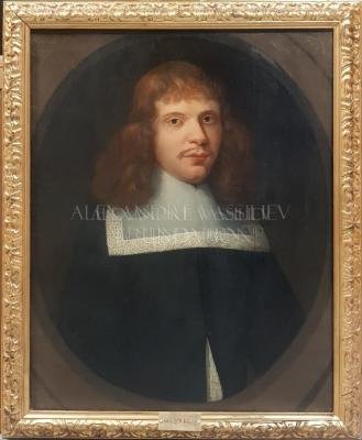 Portrait of a young man with long hair, wearing plaine square white collar. Painting in a manner of a Dutch school, portrait surrounded by an oval.