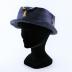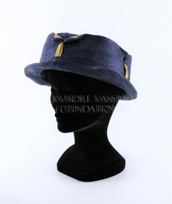 Dark blue braided woman's hat pleated straw with biege satin ribbons inserts.