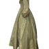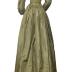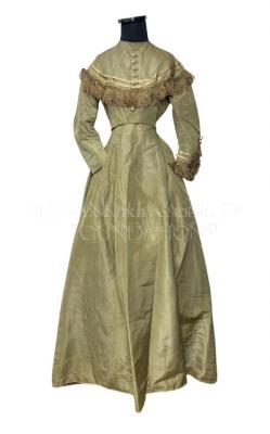 Visit crinoline dress in olive silk taffeta with narrow neckline, button-up at the front, trimmed light olive color silk ribbons decorated with a fringe on the chest and shoulders at the front in one line and on the bottom of the sleeves (on right sleeve decoration is missing).