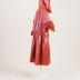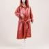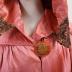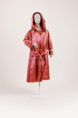 Rhodoid Copper silk satin cloak with lace inserts on the capuchin hood, sewn-in pleated satin belt decorated with soutache embroidery and satin balls, lined with checkerboard and rose crepe lining