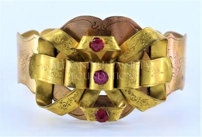 Women's hinged bangle bracelet in engraved with floral motifs brass and pinchbeck, with a stylized bow decorated with 3 rhinestones of pink, red and purple colours.