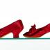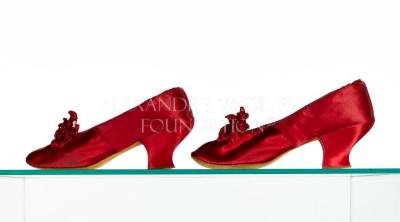 Pair of prom shoes decorated with a cockade bow. "Soul Satin Cardinal" model of the brand "Grands Magasins du Louvre" worn by Madame CHERON.