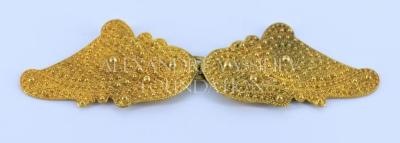 Belt buckle in brass. Possibly made after the Paris Colonial Exhibition in 1931. Supposably inspired by the constructions which represented French colonies, as the reproduction of the temple Angkor Vat in the district dedicated to Indochina. There is pearl like ornements which draw an "oriental" pattern on this buckle belt.