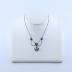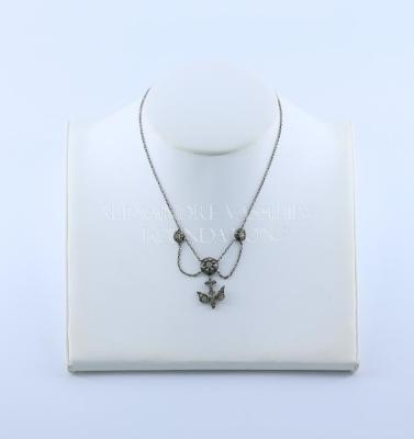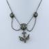 Short necklace with a stylized bird pendant decorated with rhinestones and three round pendants, each with each a rhinestone in the center.