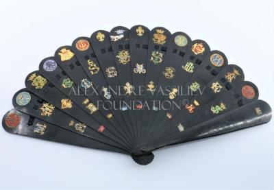 Fan mounted on wooden base with various paper collages of comtal, ducale, crowns and lilies arms. This irregular collage work is perhaps the work of a young lady for her first fan.