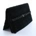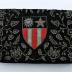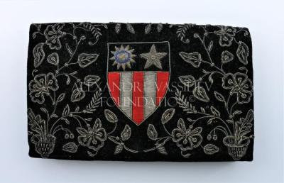 Black velvet clutch. Metal embroidery technique called zardozi used to make a floral design and family crest. The crest displays red and silver vertical stripes with a star and a sun with a blue ring in it on top.