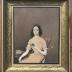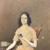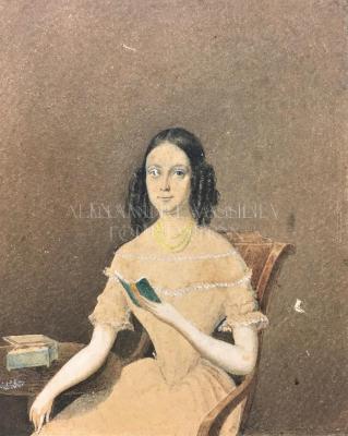 Drawing portrait of a young woman wearing a yellow dress typical and sitting in an armchair and holding a book in her hand, near to a table where is an open box.