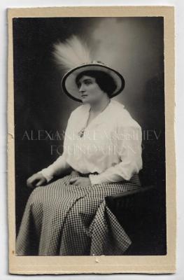 Photograph of a woman sitting and wearing a white shirt with a checkered skirt and a white feather hat with black lining.