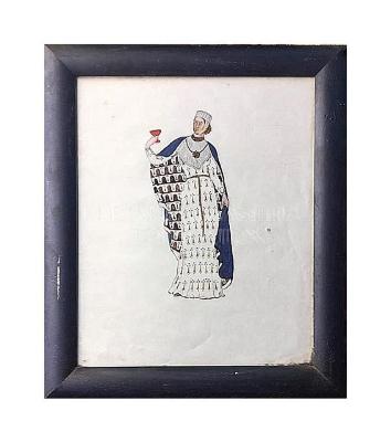 Theatrical sketch of a French woman in a RomanicĀ costume of medieval era, wearing the colors blue, white and gold, plus a protective cap and ornament. From her right hand she holds a red cup and from the back a cape falls to the feet.