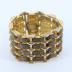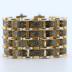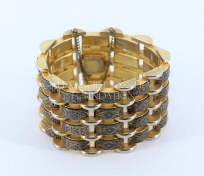 Bracelet made of four rows of articulated rectangles. Each rectangle is decorated with damascene style pattern (The Damascene style work was developed in high art by the artisans of Damascus, Syria, more than 2,000 years ago). Its intricate designs are composed of precious gold and silver embedded into brass and made by hand. The bracelet has a small chain of security at the level of the closet.