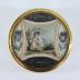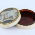 Round snuff or pill box made of ivory mounted in red tortoiseshell, the lid adorned with a miniature depicting a winged angel sitting under the tree with a letter and inscription "Don D'amitiƩ" (friendship gift).