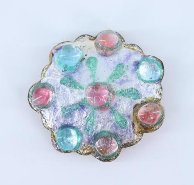 Enameled copper brooch in the shape of a stylized flower with textured beads. Can be transformed into a pendant.
