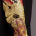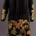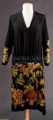 Russian style black silk embroidered day dress. V-neck bodice, drop waist, long sleeves, skirt with floral embroidery in autumn color tambour.