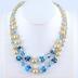 Medium short two strands necklace in pearl and transparent blue glass beads embellished on the bottom with Murano glass turquoise and white colour cut shaped beads. Closes with a clip clasp decorated with a round shape large pearl.