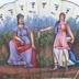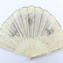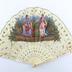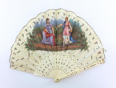 Fontange shape fan with leaf made of silk and 16 ivory sticks decorated with openwork dot and round steel nail curved design. The leaf is hand painted with gouache with a central figure design depicting two women dressed in Ancient Greek clothes represented on a background of flower bushes. Embellished with steel sequins, and the other side is handpainted with three groups of tiny flowers. The top was previosly adorned with white feathers.