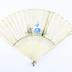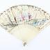Painted leaf fan with 22 ivory sticks, openwork on the top with scrolled vegetal motifs and stylized house in the center. The first and the last stick are inlaid with mother of pearl details. The main side is in paper with handpainted pastoral scene, representing four shepherds, two women and two men with a dog and a sheep on the front, on a background of a farm house. Stylized vegetal framing adorns the boards of the fan. On the other side, there is an image of a lady in blue spinning under the tree.