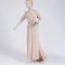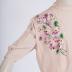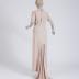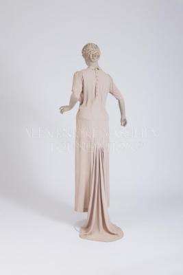 A dusty-pink crepe de chine evening gown with bolero applied with silk violets. A sleeveless bolero without fastening has applique on the right forepart. A floor-length dress with a cut-off waist has a narrow stand-up collar, a rear fastening to the waist with eight covered buttons and slit loops, short sleeves, which are tapered to the cuffs with two darts and a curved undercut at the waist with three folds on each side of the bodice. A straight skirt has a sewn-in gore at front, horizontal hip undercuts at front, which are turned into a figured rear U-shaped undercut, a fly-away train is sewn into this undercut, folded at the top into six partially stitched folds. The dress is fitted with the darts, fastened with 11 covered buttons with hanging loops by the left side and applied with the violets at the waist.