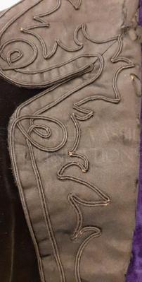 Black velvet dress with pagoda sleeves. Silk satin lapels embroidered with soutache. Front center from dark purple velvet.