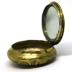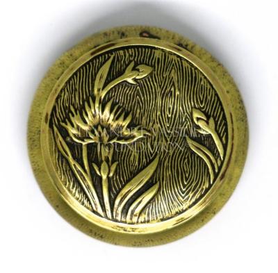 Art Nouveau pill box in gilded metal, decorated with natural designs such as tree bark, cornflower and plants. The other side of the box is decorated with arabesques and geometrical shapes.