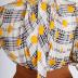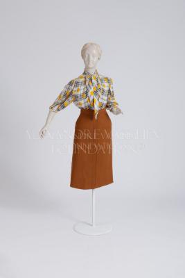 Ivory silk jersey tie collar blouse without fastening with black and grey checkered pattern and yellow polka dots print, has semi-circle foreparts, 7/8 balloon sleeves on the cuffs and a lining in white crushed chiffon.