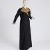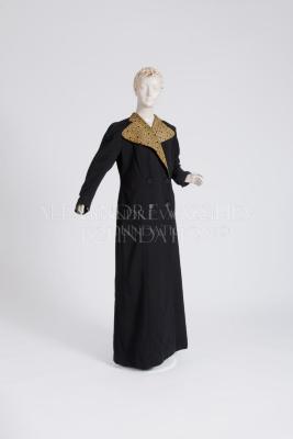 Black woolen cloth coat to the floor, double-breasted, with four black plastic reliefed buttons fastening, princess seams, set-in sleeves with raised caps on shoulder pads, and a collar with wide beveled lapels, which are covered with black and gold floral patterned brocade.