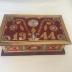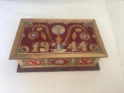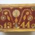 Wooden box coloured in dark red. Box is decorated with numbers „1944“ made from straw, stylized floral ornaments from green coloured paper, golden and silver foil, and natural straw.