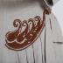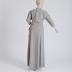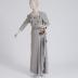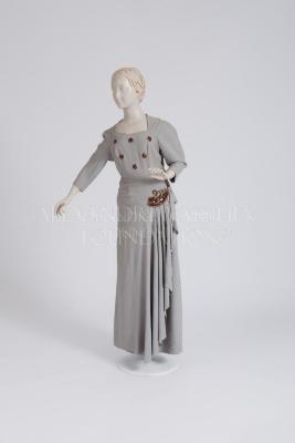 A grey wool crepe dress to the floor with trapeze neckline, a rear wrap-over and hook-and-eye fastening at the neck, the sleeves are one-piece with the top of the bodice, the shoulders are formed with two pleats on each and shoulder undercuts at front go to the armpits, the chest area volume is formed with three darts, the bodice decorated with small scattered brown sequined curls; a waist cut-off skirt has an asymmetrical yoke, decorated in the left corner with paisley brown sequins embroidery; and wrapped flounce, which is pleated on top; the dress fastens with a metal zip in the left seam.