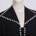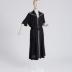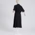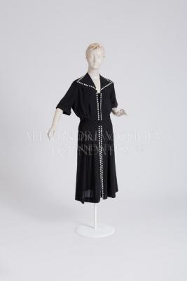 Black crepe de chine cocktail dress with apache collar and mother-of-pearl buttons. The bodice is fastened up to the waist with nacre buttons, is decorated with them by the collar edge and along the front placket on both sides; has short loose set-in sleeves with turn-ups, three stitched bodice pleats to the waist on each side and a metal zip fastening on the left side. The waist cut-off skirt has three topstitched pleats and one pintuck on each side at front, and one box-pleat in the center front is bordered with two rows of the same buttons.