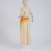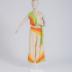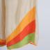 Women's summer sleeveless trouser suit made of beige silk muslin: the trousers have a yoke at front and back made of ray-shaped light green, orange and bleached red muslin details, which are dropped to the left side seam, adorned with the same rays at the bottom front of the legs, fastened with white mother-of-pearl buttons on the right side and have a belt-bow with ends made of green muslin; a separate sleeveless top made of the same muslin, on the right side has an applique of the same color ray-shaped stripes, the V-neck and armholes edged with orange muslin piping.