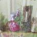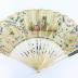 Painted leaf fan with 16 ivory sticks, openwork and inlaid with silver inserts forming stylized floral ornaments, and openwork motif on the first and last sticks. The main side is in silk with handpainted in gold vegetal ornaments with blue and pink floral garlands, embroidered with metal sequins, and decorated with a center scene representing a noble woman in pink gown sitting with a turned back to a man standing near a well.