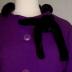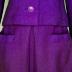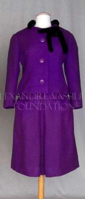 Couture skirt suit in grape-colored wool consisting of a skirt with a single pleat in the center front matched with a single-breasted jacket with interchangeable buckle. The tie collar is made from a faux fur ribbon. Silhouette labeled and numbered “115848”, belonging to the “Autumn-Winter 1962” collection of the House of Dior.