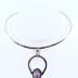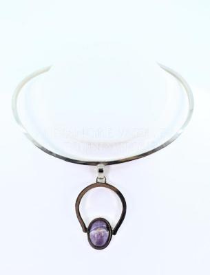 Tight choker necklace in flat shiny silver metal, bent to fit the neck, adorned with an openwork pendant in the shape of a horseshoe with an oval bottom bottom embellished with purple amethyst stone. Such type of jewellery enters in the stylistics of modernist style and so called Space Age or futurist fashion.